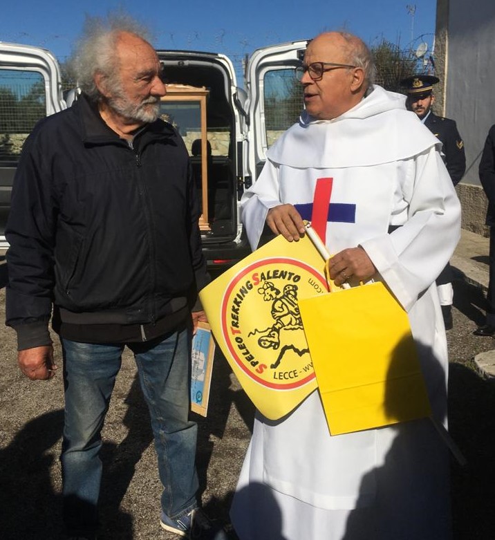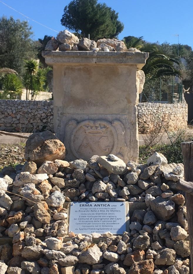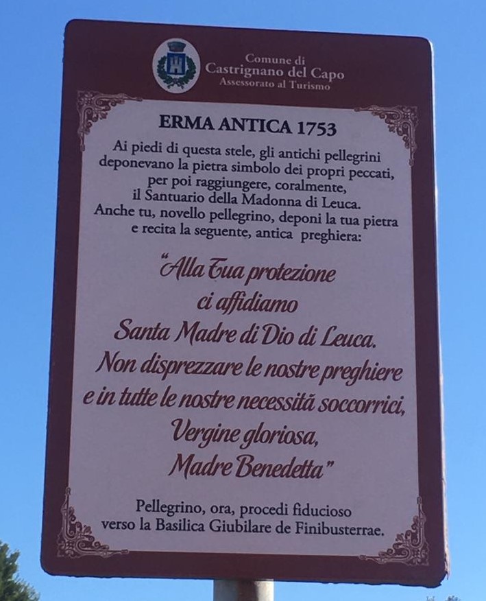 Il Colonnello Alberto Surace, comandante del 61° Stormo e dell'aeroporto di Galatina, nel momento dell'arrivo della statua della Madonna nera di Loreto a Leuca, dopo aver sottolineato i valori insiti nell'impegno umano e professionale del personale militare e civile dell'Arma Azzurra, quali: "la dedizione, la prontezza, la disponibilità, la consapevolezza dei propri compiti e la responsabilità della missione assegnata", ha conferito una targa specifica al Presidente dello Speleotrekking Riccardo Rella e ricordato anche la sua amata Rita De Matteis, per il merito di aver fatto restaurare l'Erma antica e di averla fatta erigere sul luogo dove anticamente era collocata. Ai piedi del monumento settecentesco, ad un chilometro dal Santuario della Madonna di Leuca, veniva praticato il rito, ora ripreso, del deposito delle pietre che ogni pellegrino trasportava a simbolo dei propri peccati, di cui poteva essere liberato per intercessione della Vergine Annunziata alla quale è intitolato il Santuario.